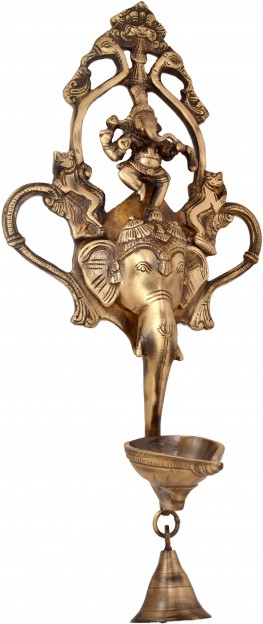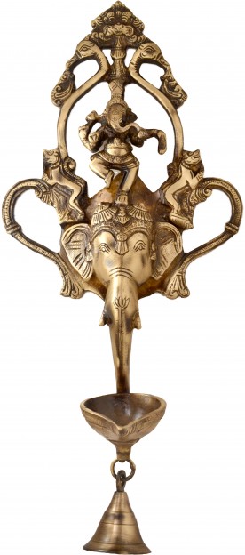 This is a uniquely designed wall hanging from the house of Handecor. You will find a decorative elephants head and a dancing Lord Ganesha on the elephants crown. The elephants trunk supports a diya stand, which has a bell underneath it. The wall hanging will give your home a religious and artistic touch. The showpiece has been meticulously carved, with an eye to minute details, like the elephants decorative head and crown. Made of ethnic brass, the showpiece has a fascinating polished exterior. The wall hanging will look pretty in your living room.