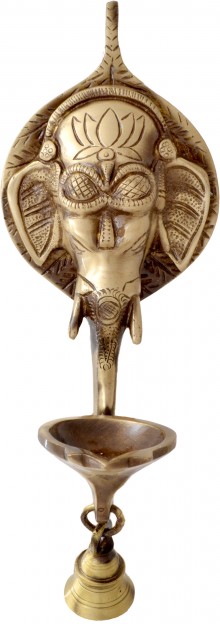 Invoke the blessings of the gods in your beautiful abode while adding on some ethnic charm to your home décor with this sublime wall hanging. crafted from brass, this antique gold item portrays the head of lord ganesha as a wall hanging and is done in exquisite detail. it is embellished with a single diya attached to the trunk at the base and is adorned with a temple bell underneath. perfect for mounting on the walls of your living room or home temple, this hanging can also be given as a gift to your near and dear ones!