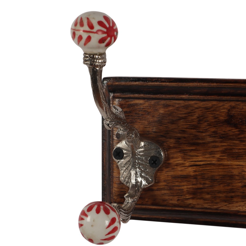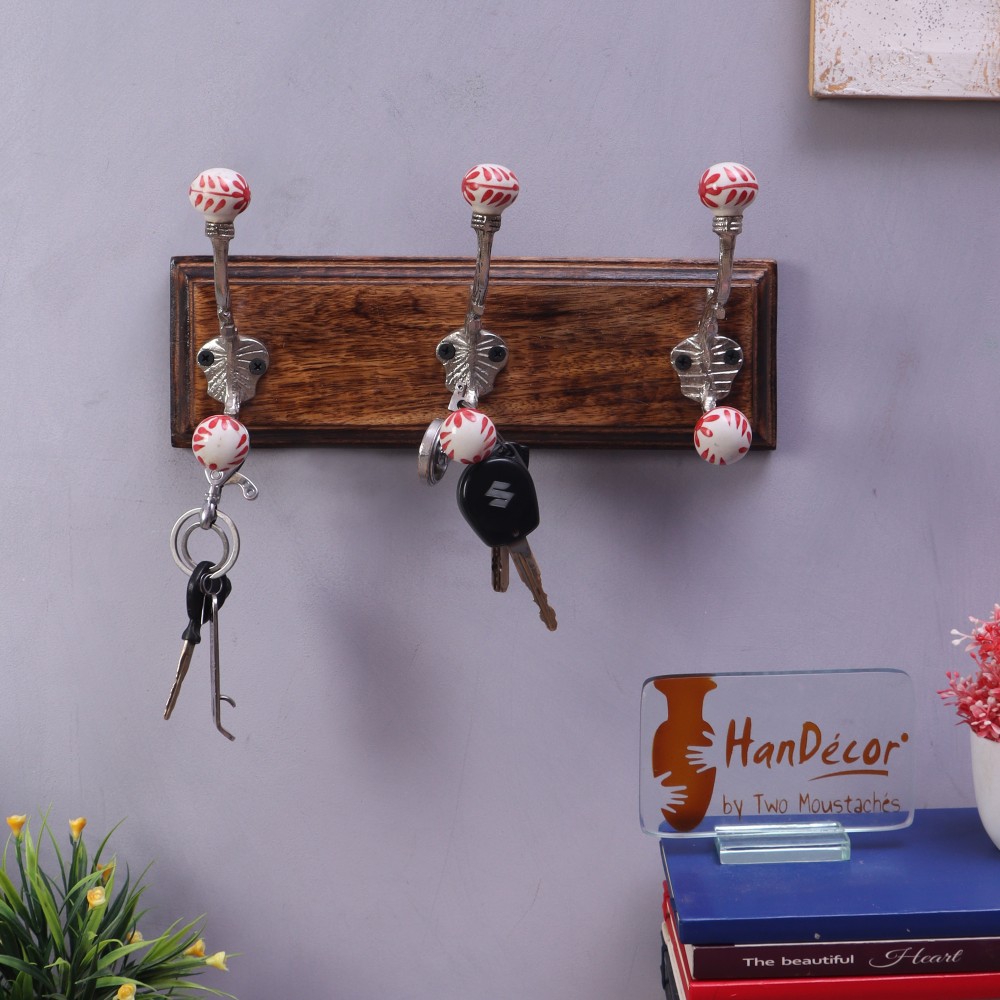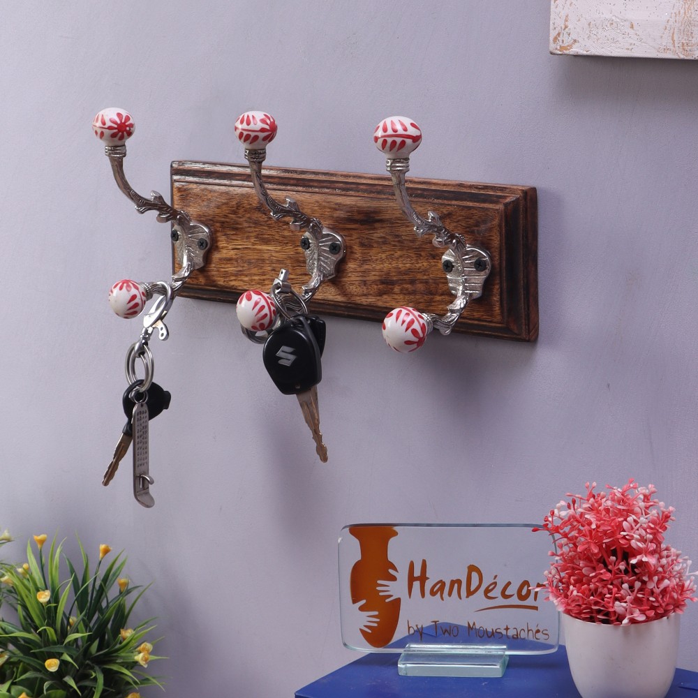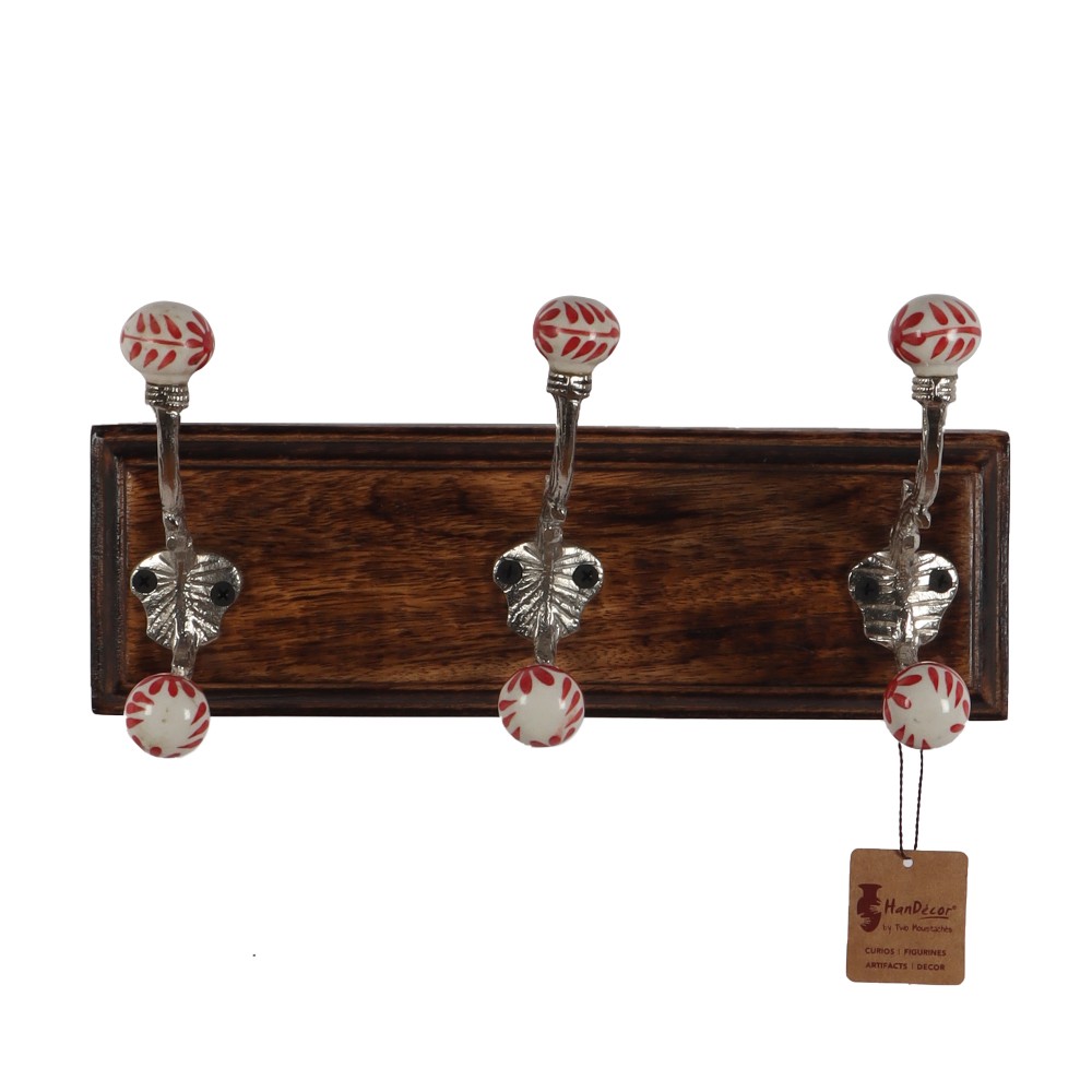 Offering charming style and everyday function, this Two Moustaches wall mounted coat rack makes it easy to get organized and clean up unwanted clutter. The panel of 3 graceful nicket finished hooks topped with ceraimic designer knobs, creates added storage space-perfect for hanging convenience in lieu of a closet or a cumbersome floor-standing coat rack. The versatile wall-mounted unit makes a great choice for small spaces or high-traffic areas around the home or office. The sturdy wall-mounted coat rack provides a horizontal row of three hooks for durable, reliable storage space. Use the three-hook coat rack in an entryway, foyer, or front hallway to keep jackets, bags, and backpacks up off the floor. The stylish hooks also work well in a bathroom, offering additional hanging space for bathrobes and beach towels, or in a bedroom to help maintain a tidy appearance and to prevent piles of clothes from accumulating. This wall mounted coat rack installs quickly and easily and mounting hardware come included in the package.