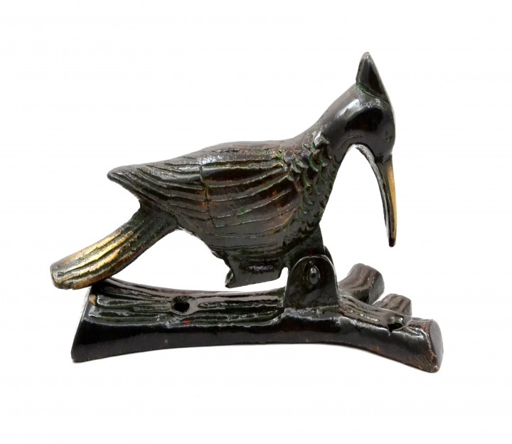 Pull the string on this antique woodpecker carving and it raps loudly, just like the real bird. It screws to a door, door frame or on the side of your house and serves as a doorknocker. Or hang it inside your house outside of a bedroom or bathroom door! The nail in the beak hits against a nail in the base and will last for years. It's a perfect gift as it brings smiles to everyone who sees it. The doorknocker is hand-carved of brass, hand-feathered to show detail. A perfect door accessory which will grab the attention of its onlookers.